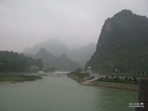 到坡月的次日,决定去百鸟岩。百鸟岩又名水波天窗,是盘阳河注入红水河前的最后一处伏流出水口,因听说百鸟岩的清晨和傍晚有百鸟离巢和归巢的奇景,我们一大早就想赶去看。在坡月拐入百魔洞的路口对面等公交车,行驶约20分钟到达去百鸟岩的路口,车费2元,下车后走过一座较宽的石桥,往左拐,再前行约700~800米即到(在桥旁有一盘阳河漂流的起漂点,价格如何不详)。