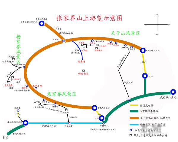 首先要说一下张家界的景区特点,分山下景区和山上景区,见图(自已做功课时画的):