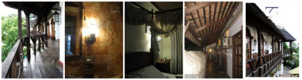 格子窗木门,红砖地面,宫廷式木架床,老式昏暗的吊灯,大理石墙面的洗手间