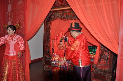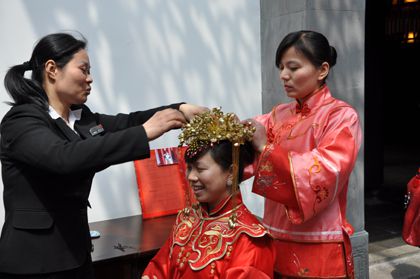 今天,两位从湖南远道而来的新人,成了香市水乡婚典中的第一对主角。新娘陈小姐说,他们这两天正是蜜月,在杭州度假,无意中看到乌镇官网上的水乡婚典产品,两人都对这种古典的仪式非常心动,于是大手笔把湖南的亲朋好友30多人全部邀请到了乌镇,一起见证他们的婚礼。