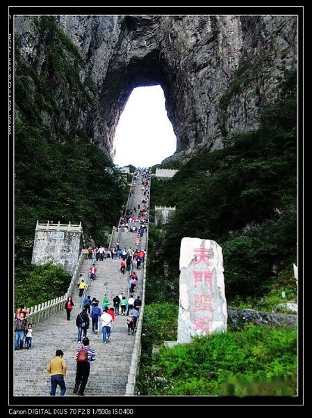 我们还爬了天门洞下的台阶,台阶有九百九十九级。台阶上面就是天门洞了,据说每年都有飞机穿过洞,进行飞行表演。还有一位蜘蛛人,他的姓名叫阿兰·罗伯特,他徒手爬上了天门洞顶,罗伯特徒手爬上天门洞顶的时间是40分钟。我觉得他特别勇敢。