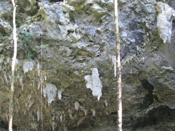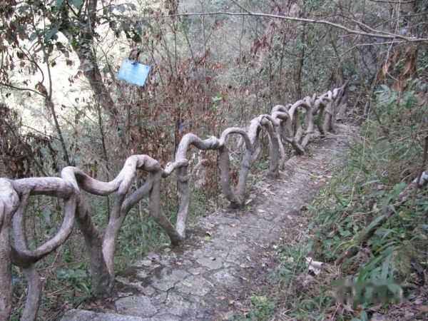 穿洞天坑亦为漏斗型天坑,坑口为垂直的绝壁,中下段为陡峭的斜坡,植物多生长在这里。只见沿路林木葱茏,树根枝藤,盘绕错节;枝叶、泥土、甚至空气均有湿润感,颇有亚热带原始雨林的景象;在树干上标有植物的名称,种类繁多,是认知坑底植物的天堂。路渐行,林渐密,光渐暗;无风声,无人烟,如无小鸟清脆、欢快的啼声萦绕坑底,会让人胡思乱想,有无魑魅魍魉、猛兽蟒蛇潜伏一旁。石板路部分较湿滑,好在一侧建有水泥栏杆,栏杆很有特色,为仿麻花状。约行走十余分钟,下到坑底,见一凉亭,亭前一溶洞,名为梭子洞,洞口外形如其名,两头小,中间大,洞内呈楔形,纵深仅几米,洞顶悬挂有几十条长短不一,形状各异的钟乳石,洞底有水,水色偏蓝,水深几许,是否与地下暗河相通,不得而知。再往前还有半月洞,因时间有限,不再往前探究,折返回去,真是下山容易上山难,攀爬了20余分钟,到达观景台,坐下休息了一会,走下观景台,原以为可以按时顺利出洞,谁知接下来遇到了麻烦事。