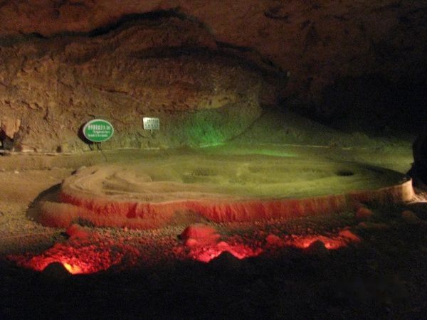 洞内钟乳石多姿多彩,尤以莲花盆著称,有世界上最大的莲花盆王,直径达9.2米,还有大大小小的莲花盆200多个,其数量及规模堪称世界之最。游完洞,我们选择从原路返回,此时洞内的景观灯已全部熄灭,导游说是为了保护洞内的钟乳石而如此设计。只能借助导游手中的手电筒照明。其洞内的游览道路多设计为莲花状圆形石板,块块相拼,仅能容一人行走,路基约高出半米,黑暗中如未能踩中莲花石板的中央,可能会踩空。我们连导游共3人,导游走在最后面,她手中的电筒亮度有限,,最前面的人难以看清路面,此时我挎包内的小电筒再度派上用场,很顺利地走出洞外。整个游览时间(包括往返)约30余分钟。