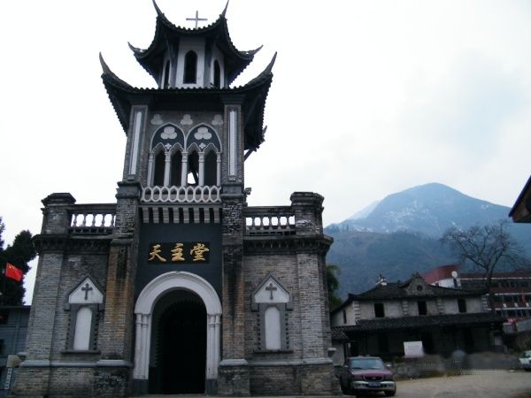 右侧为长征时红军召开磨西会议的天主教堂