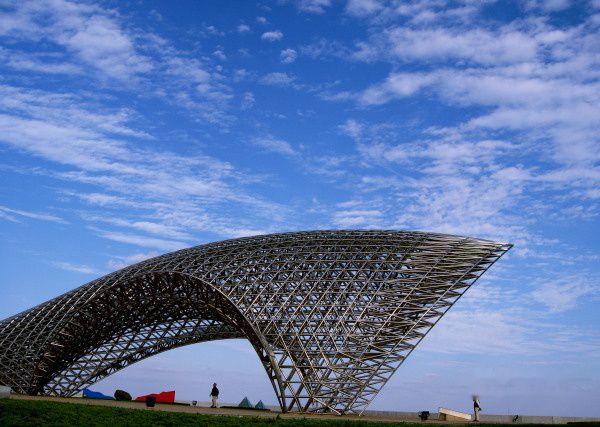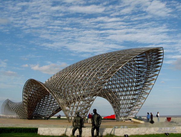 整个公园的标志性雕塑是由不锈钢管构成的双层网架结构、总用钢量约120吨的“司南”。作为世界上最早的指南针,“司南”在这里寓意着发现、交流和开放,同时又象征着庄严和财富。