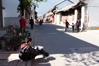 这就是我住的洋人街,我住的富春和小酒店就在那个右下角冰激凌柜子后面的一个小巷子里,绝对的闹中取静。店主非常热情好客,我们走的时候行李太多,他们就全部出动帮我们扛到停车点,总之去大理我很推荐这家。店主尹大叔很好,专门帮我们排队买去丽江的火车票。要知道他们火车站离古城有40多分钟车程呢!在他家有个长期住的法国老头,这老头最大爱好就是每天下午只穿着裤衩在三楼晒太阳写书法,会说点中文还会其他语言,就是不会英语,不知道是不是故意的。哈哈哈哈~~~