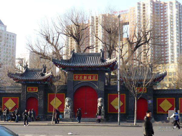 寺院的山门由并列的左中右,一大两小三座拱门组成,门楼檐角飞翘,错落有致。中间正门上书“护国般若寺”,两侧小门上分别是“清净”和“禅林”,门前两座石狮,两侧的红墙写着“南无阿弥陀佛”六个红底的金色大字。走进山门,寺内苍松翠柏,可以想见,待到春暖花开时,寺内树木成荫,再伴着暮鼓晨钟,实在是闹市中难得的清净所在。