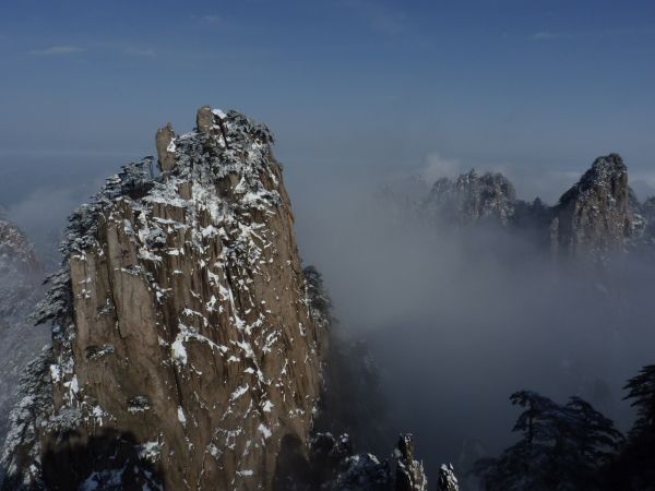 12月12号到16号,两人去黄山旅游,12月13第一天小雨天遇到雾但也遇到10分钟云海,第二天遇到大雾,但看到了雾凇,小规模的,背阴和风口的地方有了,第三天遇到暴雪,我们在始信峰留下第一串脚印,在风雪中穿行,第四天雪过天晴,拍下了蓝天下的雪景,洗了飘雪温泉,不得不坐飞机回广州,在车上听师傅讲,雪后的第二三天早上6点到9点会有云海出现,很遗憾,不过已经很好了,留下念想,下次雪后再上黄山,雪中黄山最美,但是行程却要早做安排: