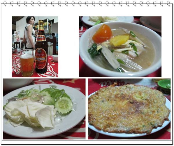 9:30从T2起飞,12点多到了广州。广州机场很不给面子,中转的航班偏巧是离我们降落最远的停机坪,被迫走了很多路。广州机场还不错,很大很明亮,不过免税店没太多意思,仲肥买了件衣服和一条camel。当地时间下午5点多,我们平安降落在暹粒机场。一下飞机就感觉到一股潮湿的热浪,围观下越南航空的灰机,赶紧领了行李过关。在这里要说下,那边的官员真是不要脸,直接管仲肥要钱。虽然1$小意思,但是这么明目张胆还是很让人出乎意料。仲肥没零钱,拿了张10$给他找,官员就很不情愿地从自己兜里掏出一堆皱巴巴的票子找给他,还不忘抬头看一下监控。早听说入出境的时候会被克扣,没想到还真碰上了。跑偏了跑偏了,过关之后就遇到在那里等候我们的司机导游小洪(以下简称小红),他很热情地接待我们上车,把我们送回酒店。我们住的Prince Angkor位于暹粒市的中心,出门步行7-8分钟左右就可以到Night market和pub street等晚上最热闹的市集。酒店属于闹中取静,房间视野开阔,家具都是上好的木材制成的,而且绝对没有蚊虫,欣慰啊~放好东西后,小红领着我们去了一家离酒店很近的饭馆,品尝地道的柬餐:臭咸鱼饼,高棉酸汤,高棉咖喱鱼,配以香甜的米饭,非常有特色。小红说柬埔寨人民吃东西是很简单的,基本上就是青菜加主食,肉很少吃。他说普通百姓的生活不是很富裕,从小吃的就比较少,因此身形也比较瘦小。跟他待在一起的3天半,我们聊了好多,后面会具体说。