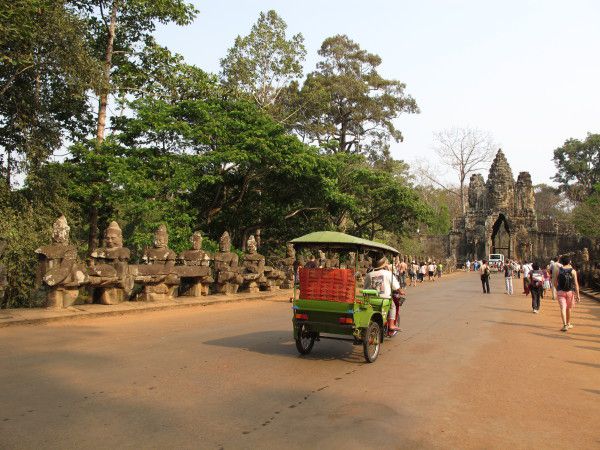 由于天气条件不好,我们没有早起看日出,8点在酒店门口等小红来接。坐在93年的Camry里,以时速30公里行驶在无数橡胶树、棕榈树、菩提树环绕的林荫路中,有种恍如隔世的感觉。道路两旁同朝景点进发的tuktuk里,都是一张张满怀期待和憧憬的脸,都是急切盼望一睹深藏在密林中奇迹的神情,我想我们大概也是这样吧。