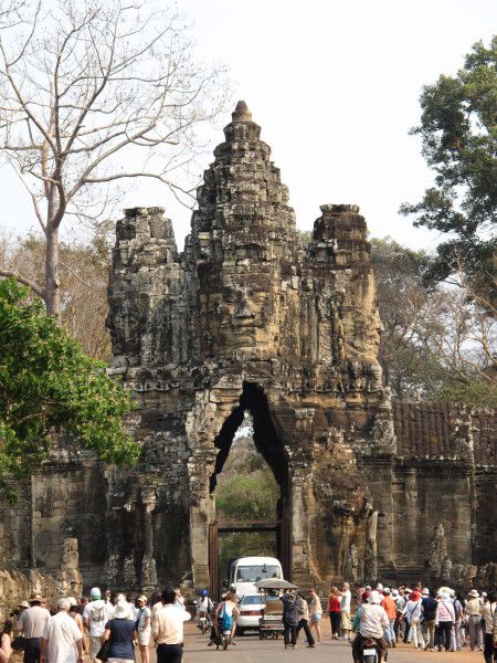 绕过Angkor Wat,我们直接来到AngkorThorn的南门。远远就望见巨大的人面雕像在俯视我们,时空瞬间被凝固,仿佛回到了吴哥王朝盛世繁荣的远古时光。还没进入王城,就已被某种气场震慑,这种气场不是参观故宫时感受到的皇家气派,而是对于宗教和神王近乎狂热的膜拜的集中体现。