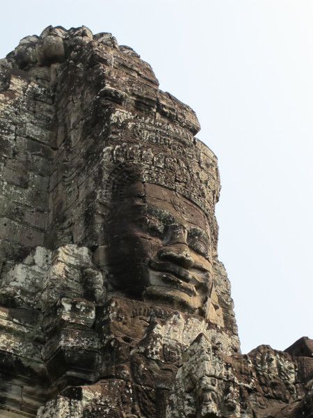 穿过南门不远就到达了我们参观的第一个大景点Bayon。虽然在旅行之前已经对主要景点的整体建造历史和婆罗门教佛教等大背景进行了了解,面对如此巨大的建筑群和异常精美的雕刻还是会感到猝不及防,墙壁上吴哥王朝战争中宋代援兵的身形之传神,实在令人叹为观止。可爱的小红一边给我们讲解历史和宗教,一边还不忘搞怪地模仿墙壁上婆罗门教仙女的姿势。这里的五十几张人面雕像都在微笑地望着众生,我们在最著名的高棉的微笑前屏息瞻仰,Jayavarman七世神王那威严而平和的面容穿透时光深深烙印在我们心中。