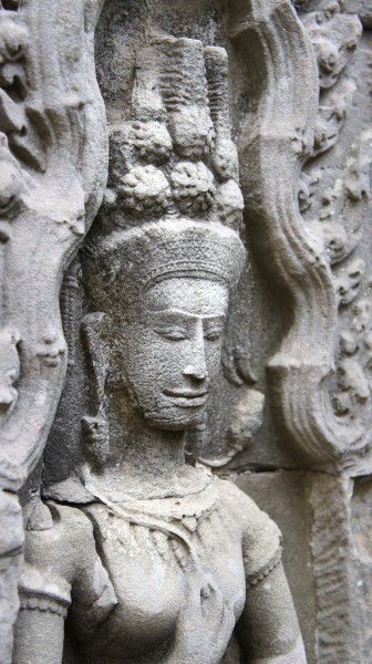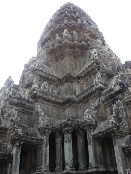 迎着升起的朝阳,跨过护城河,我们进入了Angkor Wat。无论在脑海上想象多少次,都不及亲眼所见的万分之一。Suryavarman二世王对于这座建筑倾入的心血是无法用语言形容的。第一层四面回廊布满讲述宗教故事的浮雕,第二层各式仙女以及宗教雕像,第三层必须四肢攀爬才能完成的天堂阶梯,既显示君王和整个王朝对于宗教至高无上的信仰,又透露出吴哥帝国的无限繁荣。来自世界各地的游客触摸着这一奇迹,感受着来自古代的力量。这天天气比前一天热,几乎都是逛一会儿就要在阴凉处避避,菩提、橡胶还有很多无法翻译成中文的树肆意地生长着,相比建筑更让人有强烈的亲近感。美中不足的是Angkor Wat正在进行修护,正面拍摄一定会拍到绿色的修护棚,实在是很遗憾。