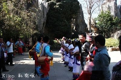 在景区里有一个跳舞场,会邀请石林附近彝族村落的人轮流来这边每天表演彝族歌舞。男人们弹的就是著名的三弦鼓(名字好像是这个,嘿嘿)。