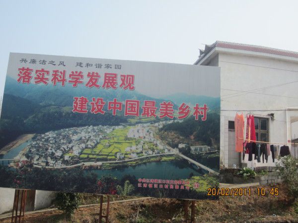 在樟桂圆宾馆下车,然后往回走,找到下面这个招牌“落实科学发展观,建设中国最美乡村”