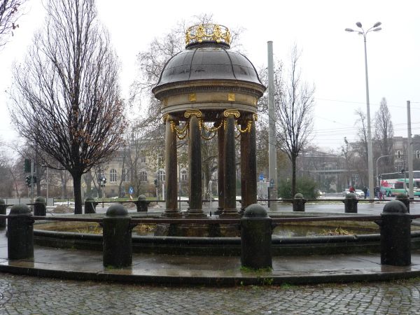 新城最有名的景观建筑莫过于巨大的金色骑士雕像了,这座雕像就坐落在易北河边,背对老城区,剽悍的金色骏马两个前蹄高高扬起,很有气势。这是为纪念选帝侯奥古斯都2世离开德累斯顿老城前往波兰就任国王而建造。在雕像边上是一座带有金顶装饰的类似我们的凉亭一样的喷泉,因为水的压力差的原因,这里四季都有涓涓泉水涌出。在金色骑士的正前方就是新城的阿尔伯特广场,两边有很多的各式店铺。并且这里也设置了一个圣诞集市,与老城那边的市场相比,没有多少游客,往来期间的基本就是住在附近的一些居民,因此清静很多,商品的价格也要便宜好多。我也非常遗憾的发现,我又一次花了大头钱。所以那条绝不在旅游景点购物的至理名言一定是要严格遵守的啊。为了弥补损失,我决定再次出手,又卖了几件小玩意。在并不大的阿尔伯特广场上还有一个小小的参观亮点,就是德国伟大的诗人,哲学家,历史学家及剧作家,在德国文学史上的地位仅次于歌德的席勒老先生的纪念碑。这是一座白色的席勒全身雕像,年轻的诗人左手拿着一本书籍放于胸前,右手下垂于腿侧,头微微上扬,注视天空,似乎仍然在构思着伟大的作品。