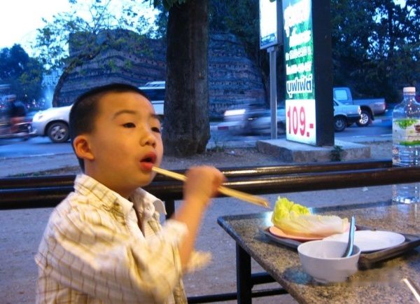 下午睡醒觉已经快五点了,洗完澡后,我们坐嘟嘟车来到古城东北角,这里有一家本地很出名的火锅店。这里是109B一位,自助餐形式,小孩半价55B,1.5升饮用水35B,一小桶冰15B。老板会一点普通话,要不然还挺麻烦。经老板介绍我们才会吃。这里的火锅是用木碳的,锅是特制的,中间凸出来,并且有一些缝用于透气,周边则较低,可以放水煮汤。在中间最高的地方放一块肥猪肉,就会有油流下来,这凸起来的锅顶则用来放肉。炭炉将肉煎熟,外围的水用于煮青菜。自助餐有猪肉,牛肉,五花肉,猪肠,牛心顶等肉食,也有蔬菜,水果,雪糕,炒饭,面饼。各种试过后我们觉得牛肉和五花肉煎后是最好吃的。吃的过程中如果锅焦黑了可以要求更换的。