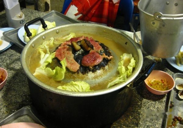 很特殊的火锅,肉是煎熟的。