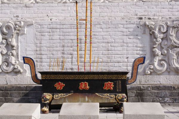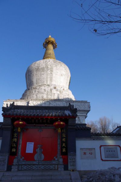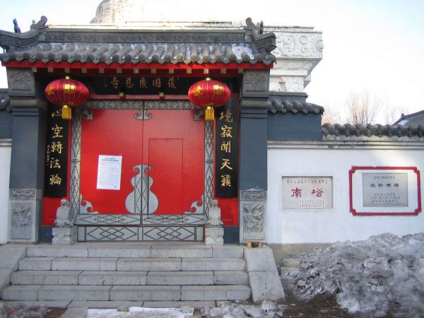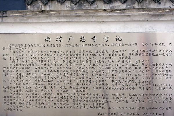 如果说沈阳北塔是一座城市,这沈阳南塔就如同一座小村落,它的寺院方方的很小,塔座到墙的距离只有几米,以至于我只能仰视着拍照。寺里只有完整的南塔,没有任何厅堂楼阁和佛像供奉。院子里依墙而建了几间簇新的瓦房,好像是守护者的住处。严格的说,这“广慈寺”只是一个传说呵。不过墙上这个《简介》却是北塔寺院里没有的,它很详实的介绍了沈阳四塔四寺的历史和今天。