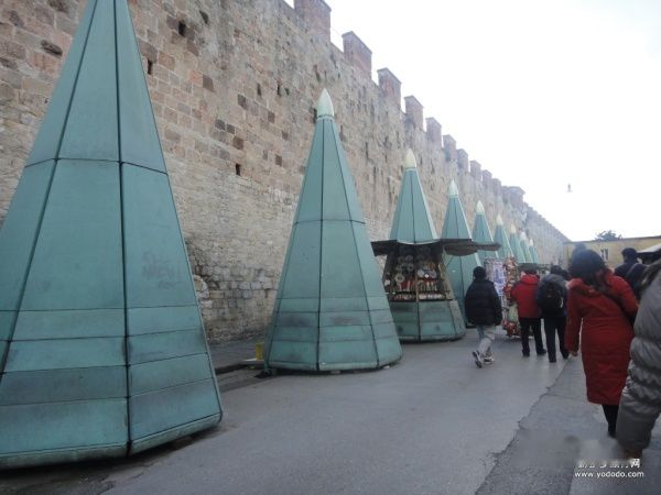 不多不少,大约四十分钟,我们抵达了比萨,导游照例交了进城税,大巴停在了斜塔边上的停车场上。首先映入我们眼帘的是一排玻璃锥形塔。大家可以猜猜它们做什么用的。可能眼睛尖的朋友已经发现,它们其实是一个个商亭,不过这种设计很方便,很环保!
