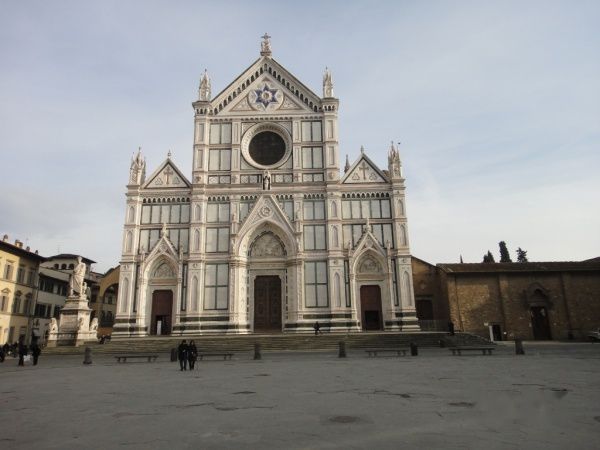 在众多团友流连在当地的皮货店时,我参观了圣十字教堂,这个教堂远不如圣母百花大教堂恢宏,但是前面的广场极为宽阔,教堂内有但丁、伽利略、米开朗基罗、马基雅弗利、罗西尼等276位伟人的墓。内部的装饰也出自许多艺术家之手,其中最出名的有走廊右侧第5根廊柱上多纳泰罗的金色浮雕《圣母领报》、正殿的巴尔迪礼拜堂内乔托的湿绘壁画《圣弗朗西斯科的一生》(Lavita di San Francesco)、左侧廊多纳泰罗的《十字架》(Crocifisso)。