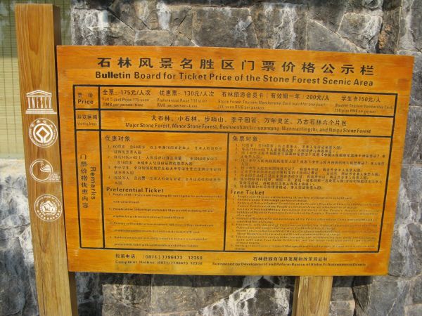 11:16我们到达石林。来到售票窗口,网上说140元的门票已经是175元了……回想起1984年第一次来石林玩5元的门票,不由得对物价飞涨唏嘘感叹。仔细一看,除了大石林、小石林、步哨山、李子园箐和万年灵芝,还包含了乃古石林。我于1989年去过乃古石林,于是心中预计一下时间和行程,决定抓紧时间游玩大、小石林就赶往乃古石林。
