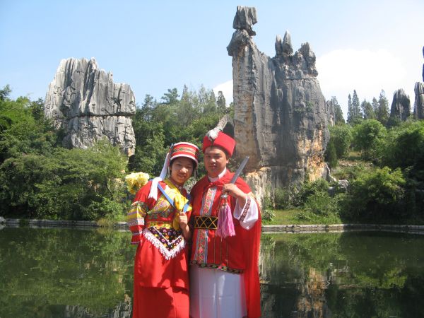 幸好人还不算多,尚能瞅空抢位照相。老婆拉着我租了一对民族服饰拍照留念。老婆特喜欢这些民族服饰,大概就因为她是个完全汉化了的彝族吧。呵呵~