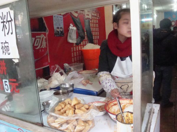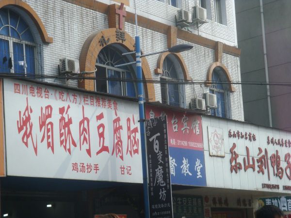 看看时间已经是一点十分了。我们决定先把酒店安顿好,然后吃些东西再前往乐山大佛。这里要隆重介绍小东子乐山的闺蜜——小兔子了,一位二十四岁属兔的美女。我们是在她给我们预定的凯宾酒店大堂见面的。第一眼就喜欢上这个川妹子了,长得小巧伶俐,最棒的就是她热情地为我们推荐了乐山的超级地道小吃。大家安顿好行李,就展开了美食之旅。毕竟这时候肚子已经撑不住了。小兔子首先带领我们去品尝了甘记峨嵋酥肉豆腐脑。