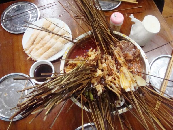 往里走每张桌子又是人头攒动,十分火爆。我们找了张四方桌坐定,一会功夫店小二就端了大大一盆串串鸡上来了,红通通的红油,满满的芝麻,口水立马疯狂分泌。