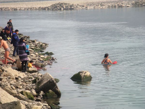 江面上有冬泳爱好者正在畅游,不得不佩服这些运动细胞充沛的人们。
