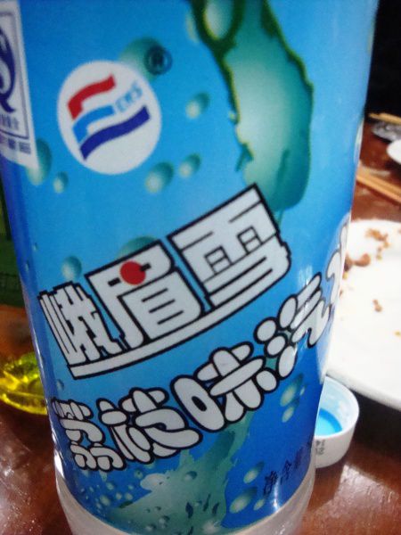 特别推荐:串串鸡里面的鸡脚里面的筋特有咬头!还有,我的最爱!这里的土豆是相当好吃,切得飞薄,沾一下钵钵里面的汤汁,吃在嘴里脆嘣嘣儿的。还有薄饼,4块钱一份,有点像春卷耶~~饼很薄,都可以看见里面的馅料了,左边那碗黑色沾水其实就是糖醋汁! 一口咬开,里面夹的是很细的萝卜丝丝,还有一些花生颗颗,味道嘛酸酸甜甜的。这时候小兔子还特别推荐了乐山当地的老字号饮品——峨嵋雪荔枝味汽水。据说她从念小学一直喝到现在呢!