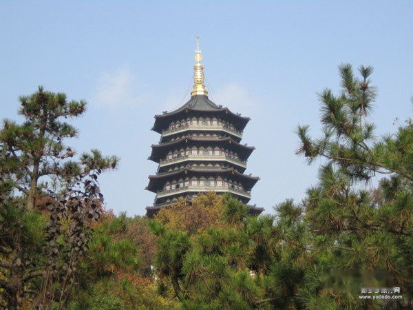 我们到达的第一站是雷锋塔。该塔原建造在夕照山峰上,位于杭州西湖南岸南屏山日慧峰下净慈寺前。雷峰为南屏山向北伸展的余脉,濒湖勃然隆起,林木葱郁。但民间因塔在雷峰之上,均呼之为雷峰塔。原塔共七层,重檐飞栋,窗户洞达,十分壮观。雷峰塔曾是西湖的标志性景点,旧时雷峰塔与北山的保俶塔,一南一北,隔湖相对,有“雷峰如老衲,保俶如美人”之誉,西湖上亦呈现出“一湖映双塔,南北相对峙”的美景。每当夕阳西下,塔影横空,别有一番景色,故被称为“雷峰夕照”。至明朝嘉靖年间,塔外部楼廊被倭寇烧毁。塔基砖被迷信者盗窃,致使塔于1924年9月倒塌,从此作为西湖十景之一的“雷峰夕照”成了空名,且“南山之景全虚”,连山名也换成了夕照山。雷峰新塔建在遗址之上,保留了旧塔被烧毁之前的楼阁式结构,完全采用了南宋初年重修时的风格、设计和大小建造。新塔通高71.68米,各层盖铜瓦,转角处设铜斗拱,飞檐翘角下挂铜风铃,风姿优美,古色古韵。塔顶采用贴金工艺。它的外形具有唐宋时期江南古建筑的典型风格,远处望去,金碧辉煌。