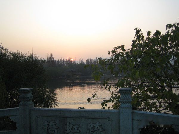 参观完岳王庙,天已近暮色。本想乘坐游船游览西湖的,但已错过了时间。于是我们2人随着**慢步苏堤。苏堤是北宋元祐五年(1090年),诗人苏轼(东坡)任杭州知州时,疏浚西湖,利用浚挖的淤泥构筑并历经后世演变而形成的,后人为纪念苏东坡治理西湖的功绩将其命名为“苏堤”。长堤卧波,连接南山北山,两边是水波潋滟,游船点点,远处是山色空蒙,青黛含翠,走在堤上,眼前的景色令人惊叹,甚至心醉神驰。苏堤给西湖增添了一道妩媚的风景线。南宋以来,“苏堤春晓”一直居“西湖十景”之首。元代又称之为“六桥烟柳”列入钱塘十景,足见人们对其的喜爱。苏堤南起南屏山麓,北到栖霞岭下,全长近三公里,沿堤栽植杨柳、碧桃等观赏树木以及大批花草,堤上建有六座单孔石拱桥,自北向南依次为跨虹、东(束)浦、压堤、望山、锁澜、映波。