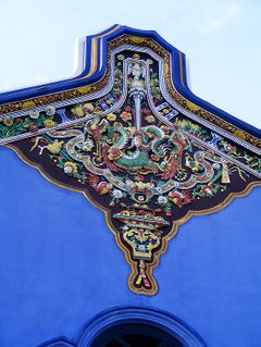蓝盈盈的颜色,还是那么鲜亮,仿佛,岁月不会在这面墙上留下痕迹。。。手指抚摸在被太阳晒得发烫的墙面上,有一丝丝灼热的痛,但是痛得真实,让我知道我又回到了这里。房檐上美丽的雕花,彩色的小人儿、盘旋飞腾却永远留在屋角的龙和凤,没有变;走廊下的凉椅,仿佛还在发出咯吱咯吱的声音,没有变;南洋骄阳下,二楼的窗户永远开着,穿堂的清风惬意吹过,只有天井里留下四方的明晃晃的一块地方,没有变;屋外的槟榔树和油棕,长长的枝叶优雅的摇曳着,伴着海风唰唰的响着,没有变。。。