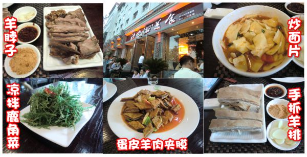 20号晚上6点多钟我们回到西宁,向樊师傅打听到西宁最有名吃羊脖子和手抓羊肉的地方“沙力海”,回到白玉招待所洗了澡后就直奔“沙力海”了(西宁的出租车司机都知道这个饭店,打的也就6块)。去到才知道这里生意果然很火爆,吃饭的人都排队排到门口,而且还要先拿个号等候。既然来了,那我们也去拿了个号,22号,眼见没那么快轮到我们,我们就跑去附件西宁的古城墙转了一圈,晚上七点多的天气很凉爽,就是有点干燥,但是总体感觉还是不错的。转完古墙回到沙力海门口坐着等候,门口还有专门提供给等候的客人喝水的,还有给客人擦鞋的,真是服务周到。里面的装修比较有感觉,卡座上有个鸟笼,有点味道,看了装修我们以为价钱一定不菲,可是事实并非如此,这里的食品价格并不高,低至5块钱的面片能吃饱,贵只几百块的羊制品也有。羊脖和羊排才45块一斤,面片才5块一碗。先尝了羊脖子已经觉得味道很不错了,羊肉完全没有膻味,配着的辣椒酱辣味适中,孜然粉咸淡刚好,吃了一块又想吃第二块。接着吃的是羊排,那个味道好的呀,现在想起来都还流口水!连我这种平时完全不吃肥肉的人,吃这个肥瘦夹着的羊排都觉得非常好吃,而且一点也不腻。到了太阳下山后已经九点半了,我们又去了躺“莫家街”,把之前没吃到的酸奶吃回来,味道确实很好,名不虚传。还吃了涮羊肉啊,特色西饼之类的,说实话,味道还都不错。莫家街不仅小吃多,特产也多,这里的葡萄干便宜又好吃,10块一斤;还有自制的薯片,香而脆,也是10块一斤,要不是薯片会压烂,我肯定背几斤带回家,太便宜了!