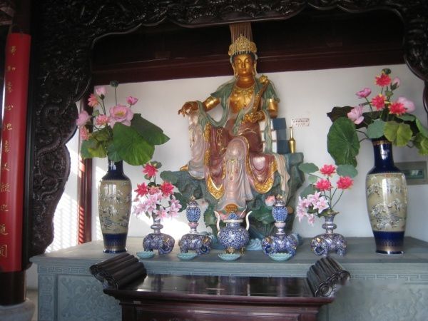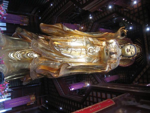33米高的室内杨柳枝铜观音像,一手持甘露净瓶,一手拿着杨柳枝,神态安详,如慈母一样俯瞰众生。观音像的头顶上是阿弥陀佛像。这座观音圣像采用纯铜88吨,表面贴金箔,观音圣像两眼当中是一颗从东海采集来的水晶。