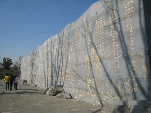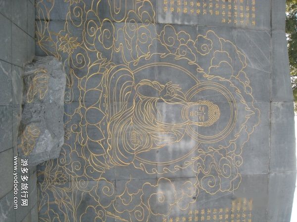 进入仿古牌坊,就能看到慈悲大愿墙了。大愿墙刻画的是诸佛的慈悲诸神和深宏誓愿。墙面佛像北面为横三世佛,南面为竖三世佛,墙面所刻文字为阿弥陀佛四十八愿。
