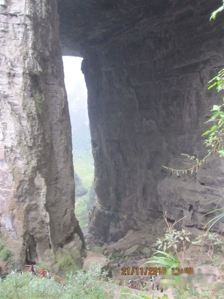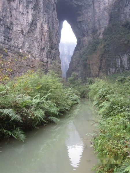 顺着山间小道穿过青龙桥底是那么的神秘,再走过小桥沿崖壁的栈道出来回头看你就看青龙桥形成的一个“口”字形的神鹰天坑,280米深也够大气的。继续向前就是黑龙桥了,走在中间就像与世隔绝的感觉!