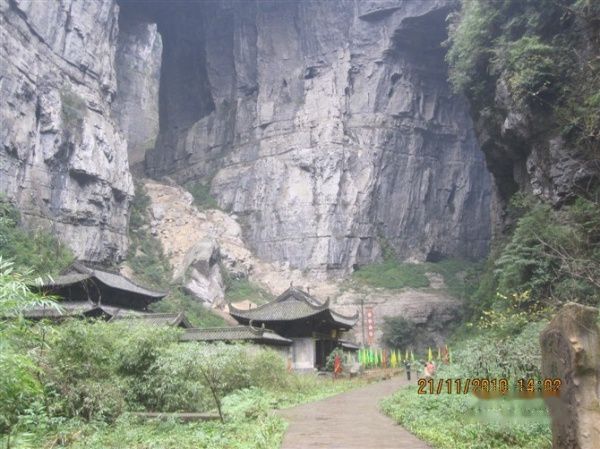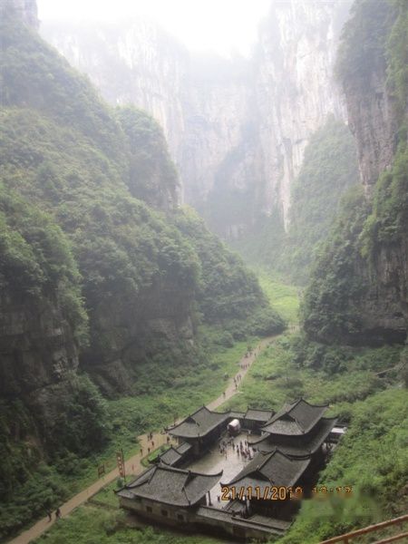 看到这组数据和眼前的景真让人惊叹不已!往左边走就是刚在上面看到的天然天坑,像是UFO登陆过流下的大坑。大自然真是神奇!顺“S”形的楼梯慢慢走你会觉得自已太渺小了,越往下走就越壮观:峡谷底就是天福官驿,看起来像是神秘世外桃源中的宁静一处,与世隔绝。这也是张艺谋拍摄电影《黄金甲 》唯一室外点。