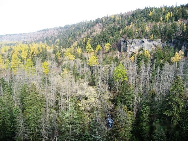 谷底森林:多以落叶松为主。在观景台可以看到整个陷下去的森林,景色还不错。