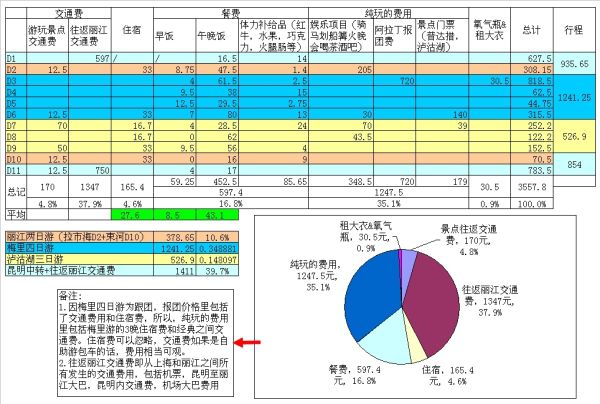 花销最大的还是往返丽江的费用,占约40%,主要还是机票。