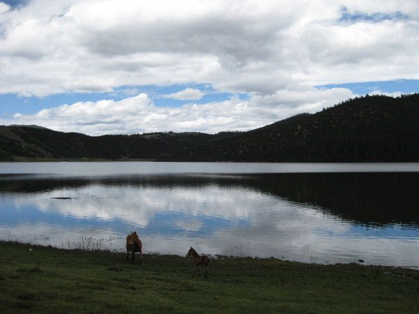 快乐片段十二:去扎西家的路上,LL一边走路一边发短信,一不留神竟然掉进庄稼地旁的水沟里,在她落水的瞬间,她身手敏捷的把手机扔了上来,但腰包里的两个相机不幸进水。要说这个水沟啊,真是不好讲里面有啥子成份,虽然水沟旁边不远的湖里很干净。按照这边牛马自由的生活状态来说,应该养分不少。这个水沟旁的地里,整天都有两匹马在那埋头吃草。中午小方还愤愤的说,这两个马整天在那忙活啥啊。。。我相当后悔我当时不在案发现场没有亲眼目睹这精彩的瞬间,在提议去扎西家之前我突然闹肚子回房间解决问题了。。。