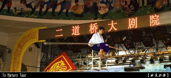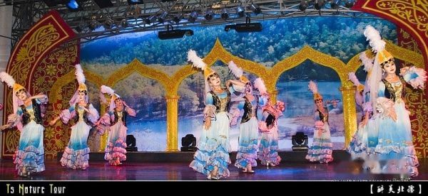 表演很有当地民族特色,为新疆主要少数民族的传统歌舞,还有达瓦孜(无安全带高空走绳索)表演,据称表演者是中国“高空王”阿迪力的弟子,技术还不赖,尤其是在绳索上跳绳的一刻,异常惊险,可惜当时灯光太暗,没有拍到清晰的精彩瞬间。据说小伙在这里已经表演很长时间了,从来没有失过手。