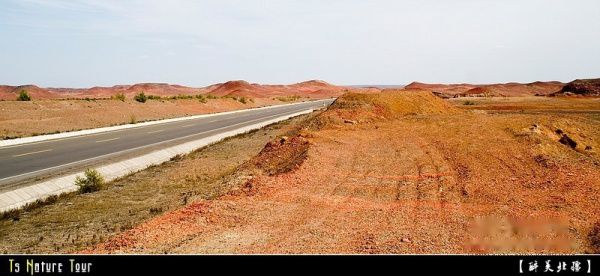 在把天山山脉远远地甩在身后的同时,迎接我们的是荒无的戈壁滩,正在为这无趣的戈壁所犯困的时候,突然间前面不远处出现一片红色的土地,原来到了火烧山了。公路两旁红色的石子中间夹杂着一些黑色的石子,一座座丘陵似的小山,都是黑黑的山头、红红的山坡,真像是给烈火烧过一般。