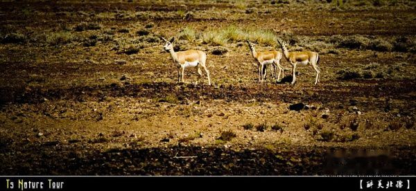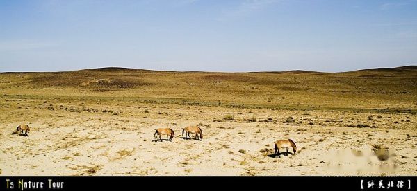 经过卡拉麦里,来到恰库尔图,总算是个像样(有些规模)的镇子,看看已是下午1、2点了,就安排吃了中午饭。再出发的时候,司机告诉我们,如果幸运的话,在后面的路上能看到野马。哦,应该是普氏野马吧!那可是国家一级保护动物!怀着期盼的心情,目光不断投向两旁的戈壁,但好久好久也没有找到。想想这野马快濒临绝种,哪有那么容易就给看到的?!正想着呢,在一段下坡路上远远看到一辆轿车停在路边,路基小坡下有几个不大的黑影。嗯,不会是野马吧?慢慢地,我们来到这些黑影旁。哈哈,果然是野马!数量还不少,有8、9匹吧。野马与我们平常看到的马长得不太一样,脸有点像驴,身材不高,颜色偏浅。这些野马并不惧人,看来是人工繁殖、放养的。拍了不少照片后,我们安静地离开了野马;后来的路上,我们还看见了羚羊、鹰等野生动物;真想不到在这么荒无的戈壁中居然还有动物生存!
