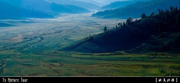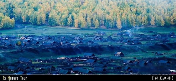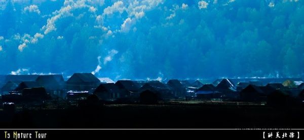 世间的事总是让人难以琢磨!下到半山的时候,一片更大的天光笼罩了整个禾木村,这时雾也小了很多,一些房顶上已经开始冉起袅袅炊烟,这正是拍摄的绝佳机会啊!赶忙下马,让马夫直接回村,回观景台已经是不可能的了,只有站在半山腰狂拍了一些缺乏立体感的片子。刚才下山时,我看着吃力地爬上山的人,心里还在偷偷乐着,笑他们晚来一步;而现在,我真羡慕那些晚到或晚下山的人们是多么的幸运!