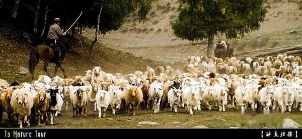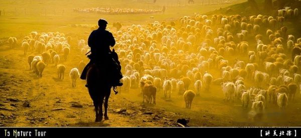 等待准备马匹中,一大群羊群从路边赶过,带起一片尘雾,马上掏出相机准备拍摄。这时耳边乍听一声“不许拍照”,回头一望,原来是牧羊人。这么好的机会怎么能白白让它溜走,掏出10元钱给牧羊人,他也就让我随意拍了。唉!现在的人都怎么啦?