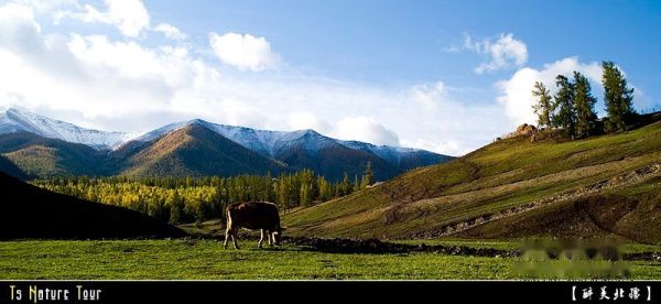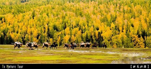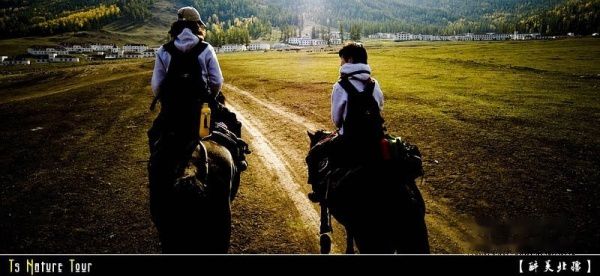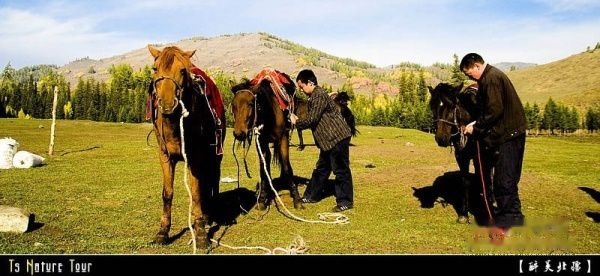马儿确实很听话,也不野,有时还停着不肯走,怎么催它也不理你,只有向导过来抽了几鞭,才慢吞吞往前走去。看到马儿那么老实,我们悬着的心也放下了,走了一段路,感觉还挺不错的。刚要进山的路上,遇到一个徒步的女孩,正瞅着她那大大的背囊不知如何是好,见我们经过就向我们求救,请求我们把她的背囊带到禾木去。向导在征得我们同意后,将背囊跨在他的马儿背上,留下我们的联系电话,我们继续往前,女孩也一步一步紧跟着。