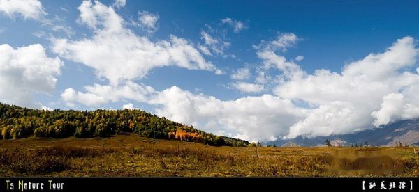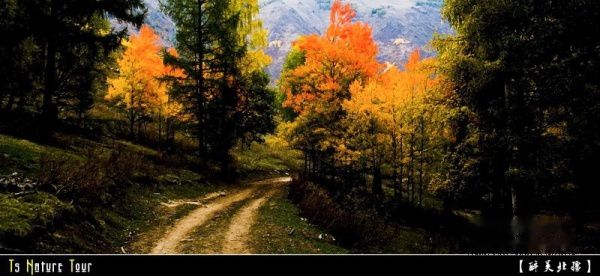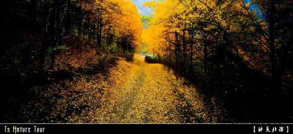 天阴沉沉的,可是马道两边的景色却是迷人的,满眼是五彩的世界,金黄、墨绿、艳红不断地跳跃在我们眼前,我们也不时地发出由衷的惊叹来回馈大自然,感谢她给予我们这醉人的景色!我真想不断要求下马拍照,但马儿毕竟不是汽车,想停就停,想下就下,再说向导一直说前面的景色更漂亮,抓紧时间赶路。