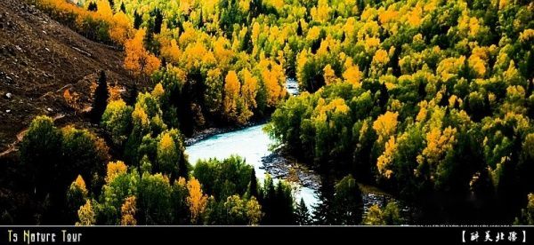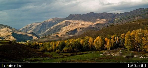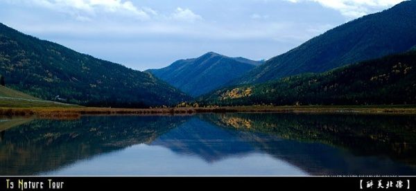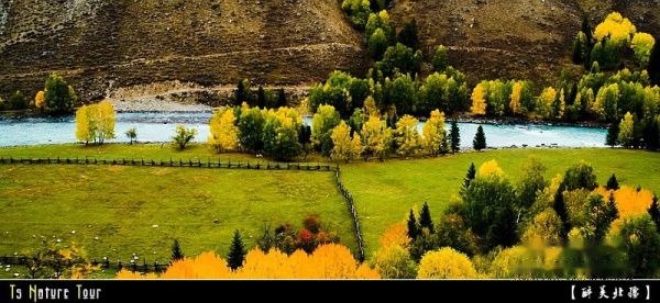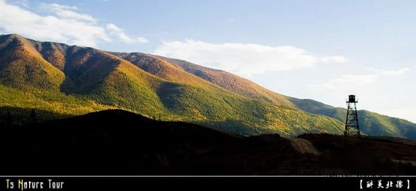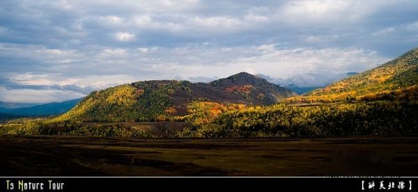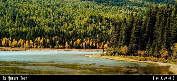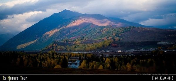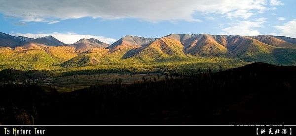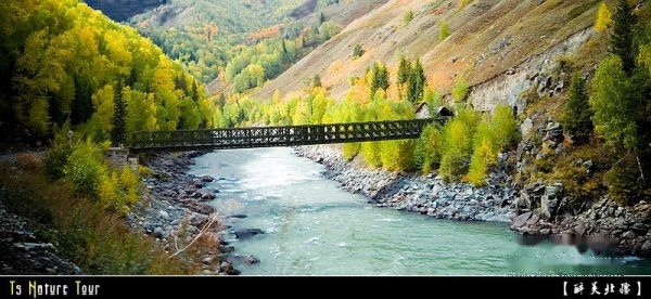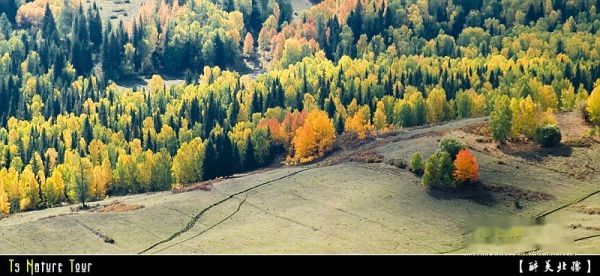 从禾木村至收费口还有30、40公里路程,一路的风景也非常漂亮,这时候天已经很晴朗了,阳光普照着群山,红的一片,黄的一片,绿的一片,片片都是那么的养眼!可惜包车司机像疯了一样地开着车,虽然我事先声明需要随时停车拍照,而他也满口答应了。我想,他在想多跑几个来回挣钱念头的驱使下,早就把刚才的承诺抛到九霄云外去了!对一个陌生人的承诺算什么,而紧紧攥在手里的钱可是货真价实的啊!我呸!